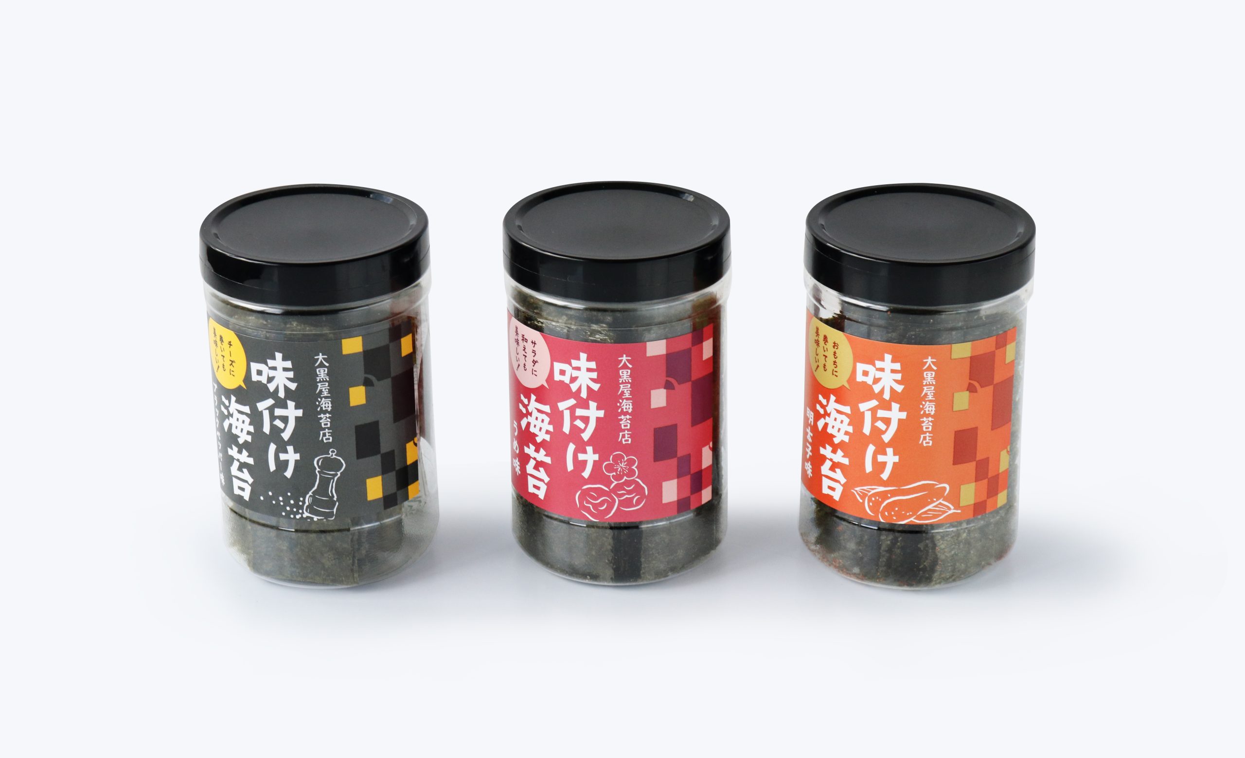ブラックペッパー・うめ・明太子それぞれの味から連想されるカラーで展開。