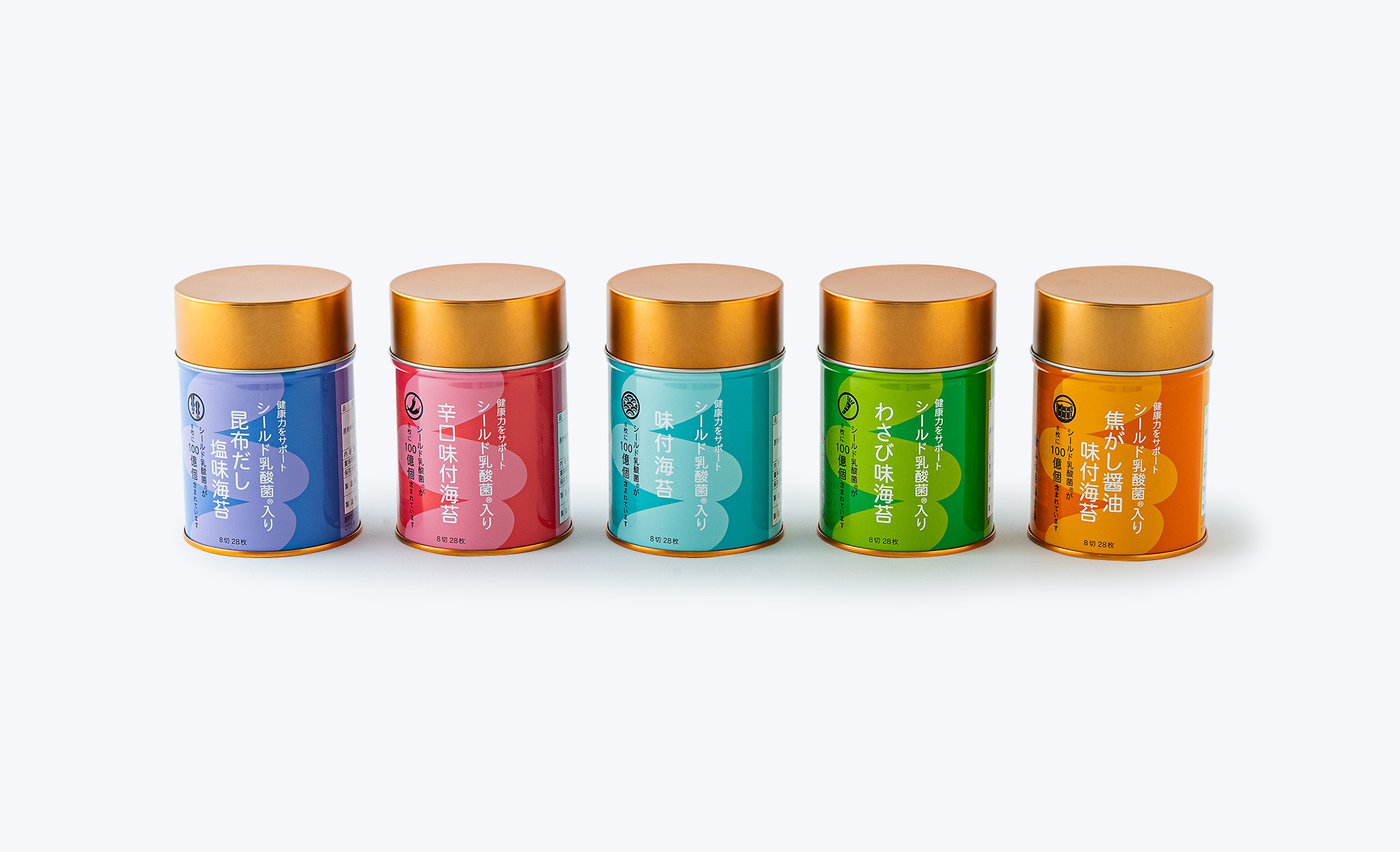 すべてondo plusカタログパッケージブランディングツール販促イラスト作成web動画 シールド乳酸菌入り海苔 2024.01.292025.12.30 老舗海苔店のシールド乳酸菌入り海苔缶5種の ギフト向けデザインのご依頼いただきました。 シリーズ全体を上品で一貫性のあるデザインコンセプトでまとめつつ、 フレーバーごとに色調とアイコンで違いを出す構成としています。 また、シールド乳酸菌の頭文字「S」を乳酸菌のフォルムに見立てた シンボリックなモチーフを採用。 どことなく乳酸菌を想像させ、 健康志向の女性に響く華やかさを意識しつつ、色づかいを工夫することで、 ギフトとして複数を組み合わせても美しくまとまるデザインに仕上げています。パッケージラベルワンポイント缶